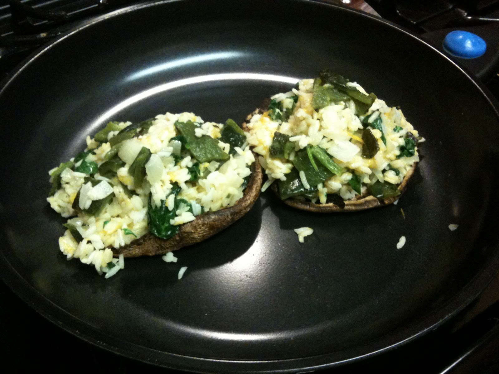 Pre-heat oven to 325. Place mushrooms capside down in an oven safe pan and spoon rice mixture into mushroom cap - use the entire mixture even if it overflows into the pan (trust me - its so good you'll want to eat it all!). Bake stuffed mushrooms for 20 minutes and serve.